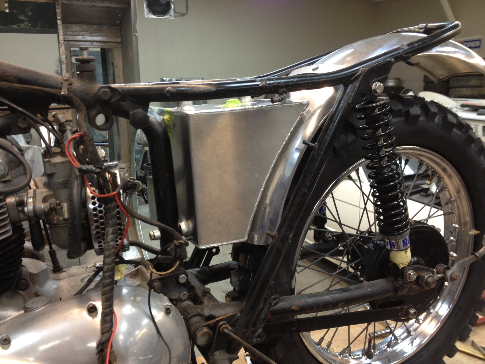 The “Sled” is coming along. When I have spare time in between Rover projects I tinker with the old Triumph. Recent additions are 13″ Hagon shocks, a raw aluminum fender from Speed and Sport, and a Webco replica oil tank from the guys at 3 Q Carroll Racing Products.