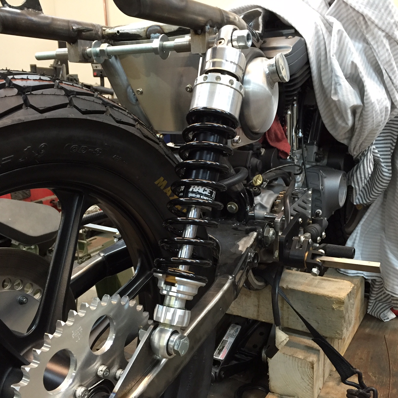 On the recommendation of Master Street Tracker builder Richard Pollock (Mule Motorcycles founder for those of you that have been living under a rock) I made two jigs/tools to help position the shocks. The first is a simple aluminum rod bored and threaded at each end (one end a reverse thread) with heim joints at each end……pretty much a mini tie rod, turn the rod one way it lengthens, other way it shortens. If you have mounts already on the bike this will allow you to mess around with proper stance and give you the correct shock length you’ll need to order. In my case, I already had a set of custom Race Tech shocks, so I set this rod to the eye to eye length of the shocks and this helped position the mounts for tacking into position (and really saved me banging up the beautiful Race Techs while messing with position).