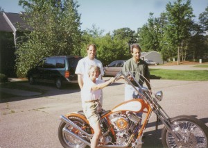 1998 Orange Krate, built by Jimmy Bortles (formerly of Razorback and Trottas Thunder Cycles), with heavy influence by “Minnesota Mike” Marquardt of Redneck Engineering. This one had it’s own V-Twin Magazine feature in May of 2000 after winning the “Custom Radical”class at the Charlotte, NC Easyriders bike show. There was a matching 1969 Schwinn Orange Krate I restored that went with the chopper. That’s my mother gettin’ the feel of the ape hangers!